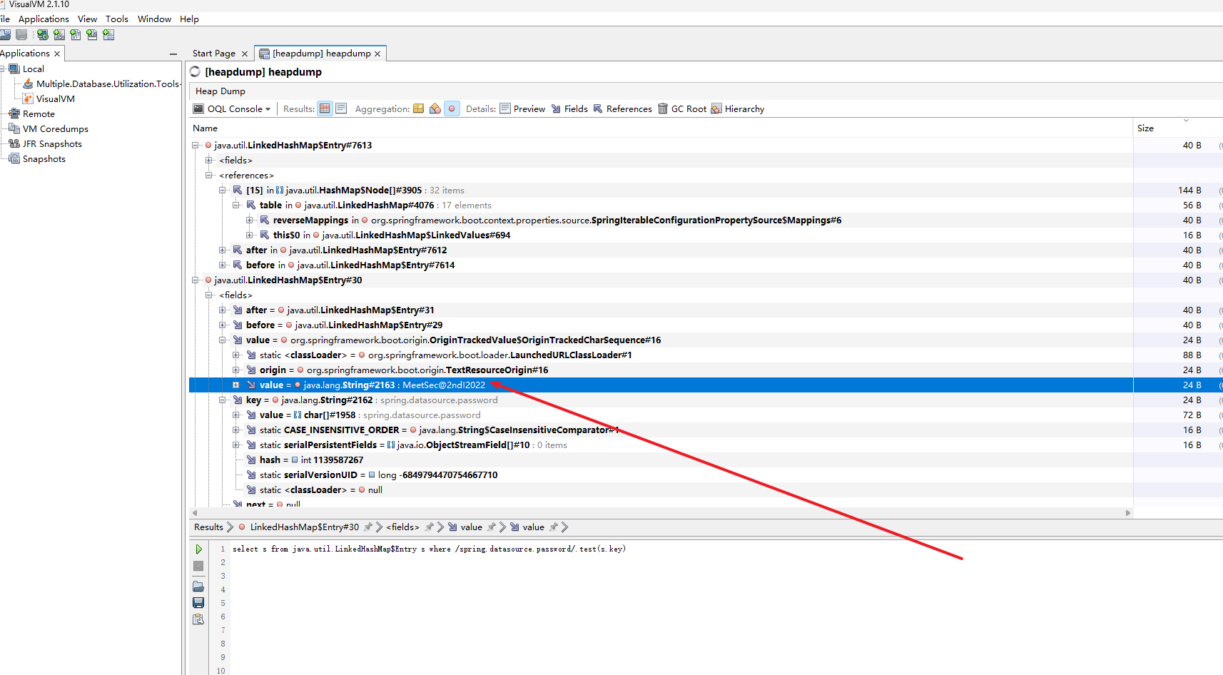| select s from java.util.LinkedHashMap$Entry s where /spring.datasource.password/.test(s.key)